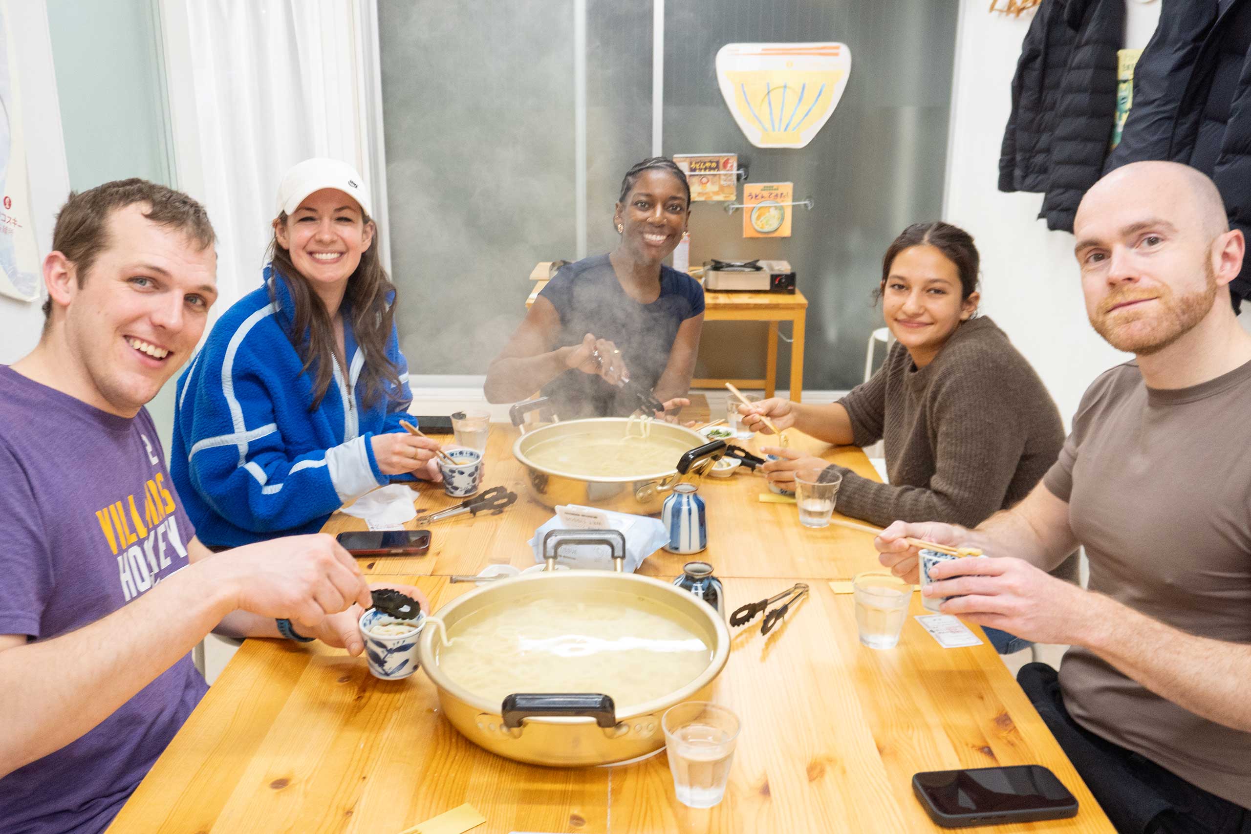 湯気の立つ大鍋を囲んで、打ちたてうどんを試食する時間。 / Tasting time around a steaming hot pot of freshly made udon. 手打ちうどん作り体験教室 2026年2月 iricosky-udon-tasting-steaming-hot-pot.jpg – イリコスキー製麺所